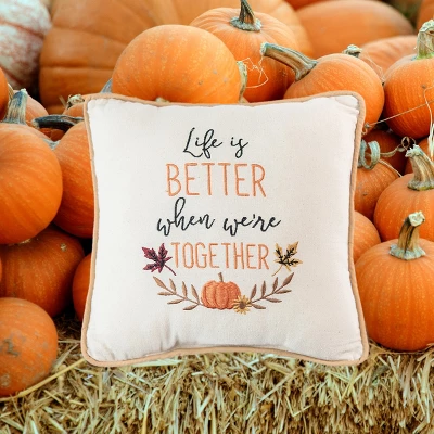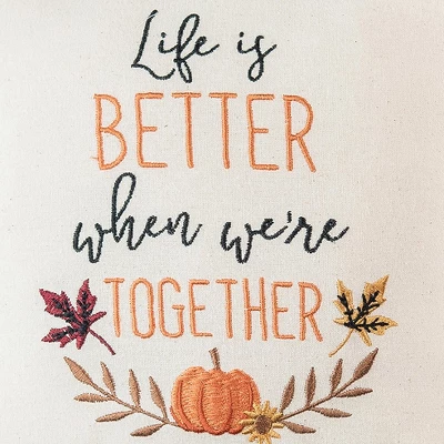 Stroll through an enchanting fall wonderland with the Life is Better Together Pillow. This truly captivating piece features a stunning array of embroidered text and leaves. Precisely crafted of soft cotton to create a unique texture and artisanal flair. Mix and match with coordinating textiles to create a spectacular autumn look.