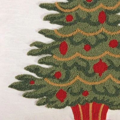 - Tufted for a unique texture, this pillow features a classic holiday tree design, accented with embroidered bow motifs.