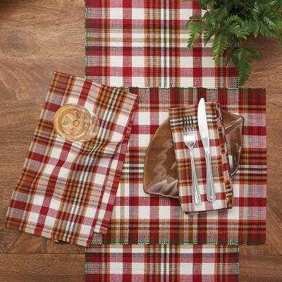 Gather around this warm, fall table collection with family and friends. The Abingdon Plaid tabletop collection brings warmth and balance with its rustic red plaid complemented by pumpkin orange, and green undertones. Crafted of cotton the classic look of this red, orange and green collection is versatile enough for holiday or everyday table settings. Coordinating placemats, napkins and table runner available separately.
