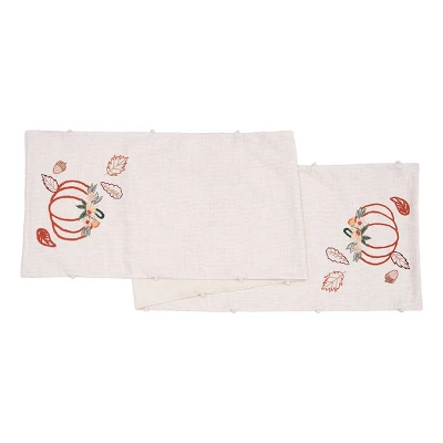 Enhance any fall table setting with the embellished and embroidered Autumn Botanical Table Linens, featuring a neutral background and a beautifully detailed pumpkin design topped with a crown of autumn florals. The napkins showcase simple, elegant, embroidered outlines of fall foliage. Pair these linens with additional harvest-inspired decor to create a stunning, season-long tablescape.