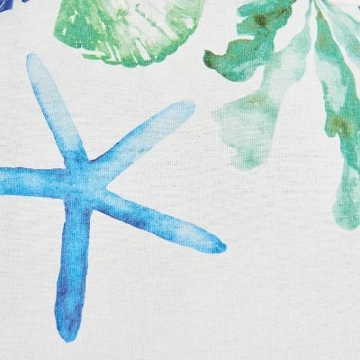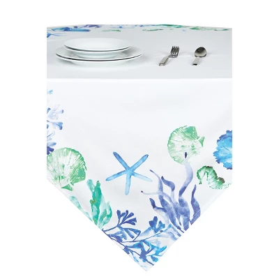 Let the soothing colors of the sea transform your entertaining with Bluewater Bay printed tablecloth. This topper features starfish, seahorse, coral, and seashell motifs in hues of indigo, aqua and green in a watercolor-inspired design that makes it easy to imagine your are diving into an underwater wonderland. Crafted of cotton and machine washable for easy care. Size: 54 x 54-inches. Love this pattern? Bluewater Bay is also available in our bedding collection.