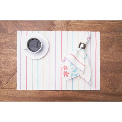 The Bunnies & Blooms printed table linen collection features a charming all-over pattern of simplistic flowers, including daffodils, daisies, and other delightful spring blooms. With a perfect springtime color palette featuring shades of pink, blue, purple, yellow, and green, these table linens offer a refreshing touch to any setting. For added versatility, reverse them to reveal a simple stripe pattern in coordinating colors, providing endless styling possibilities.