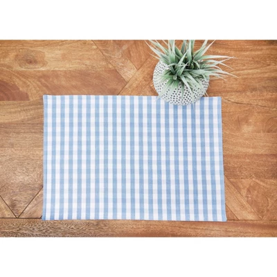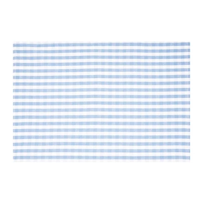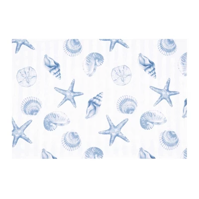 For a coastal inspired tablescape, the Calming Seas printed table linen collection captures the essence of the ocean’s natural wonders. A variety of seashell and sea star shapes are randomly scattered on a crisp white background. Rendered in a watercolor style effect, these table linens reverse to a classic gingham plaid in a coordinating shade of soft blue.