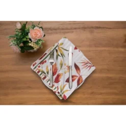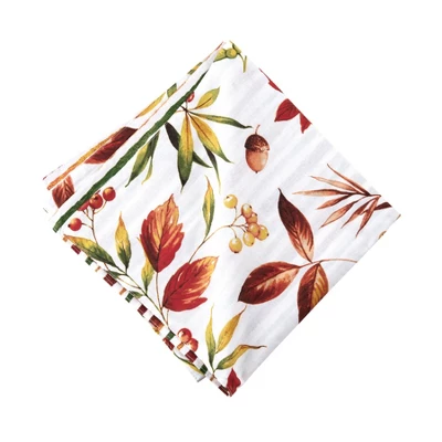 The Camilla tabletop collection creates a warm, inviting fall dining table with its vibrant jewel tones of red, green, and amber. A fall foliage motif of maple leaves and acorns fall against a white ground. Reverse to a painterly striped pattern to build a cozy mood no matter the season.