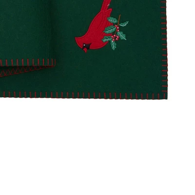 The Cardinal Holly felt tabletop collection is a gorgeous addition to any holiday decor. Featuring a forest green background punctuated with a bright red cardinal sitting on top of some holly berry leaves, the table linens are outlined with a red stitch edge. Spread some cheer with this seasonal classic!