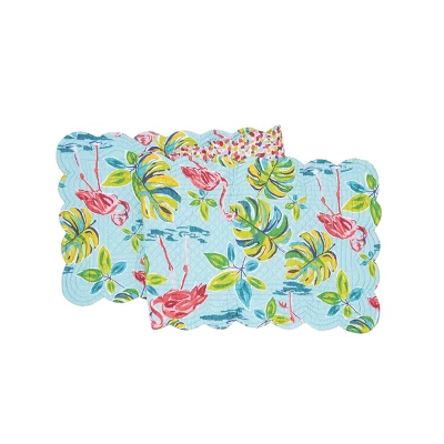 Transform your home into a tropical paradise with the Flamingo Garden tabletop collection. A bright and colorful design of painterly-style pink flamingos, green palms, and cool blue pools makes any day a vacation. Perfect for a coastal rental, a Caribbean-theme, or a whimsical summer style this vibrant collection is sure to bring fresh, bright colors to your home. Flamingo Garden reverses to a dynamic confetti dots pattern for even more styling options. Finished with a scalloped edge, this tabletop collection is crafted of 100% cotton and hand guided machine quilting. Stains and spills are no problem, machine wash cold and tumble dry low for easy care. Love this pattern? The Flamingo Garden collection is also available in our bedding collection.