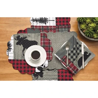With a classic printed patchwork of wilderness motifs and coordinating red plaids, the Hayden tabletop collection brings a touch of rustic lodge style to any dining room.