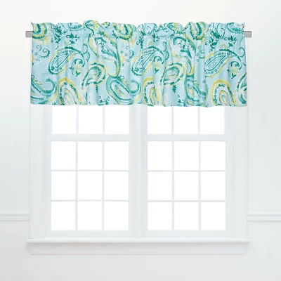 The Jade ruffled valance brightens your home with a fresh and colorful design. Displaying a large-scale paisley design in green and chartreuse motifs with floral accents on an enlivening light turquoise base. Jade brings a breath of fresh air to your breakfast nook, kitchen bar or dining room, creating an welcoming scene for any day of the year. This ruffled unlined valance is light filtering with a 2-inch rod pocket and a 1-inch decorative header. Crafted of cotton, machine wash and tumble dry low for easy care. Love this pattern? Jade is also available in our bedding and tabletop collections. Each valance is 72″ wide, hanging rod not included.