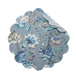 Add comfort and style to any home with the Morrison Damask quilted tabletop collection. This sophisticated damask-floral print reverses to a coordinating stripe pattern in agreeable shades of blue, green, and tan. These table linens feature scalloped-edge placemats for an added touch of style. Love this pattern? Morrison Damask is also available as a bedding collection.