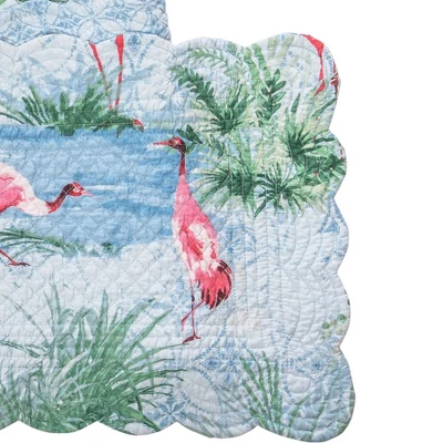 Transform any tabletop into a beach paradise with the coastal-inspired Paradise Coast tabletop collection. It features flamingos in tropical blue and pink hues and a natural feel, making it the perfect choice to bring a relaxing atmosphere to any space. The scallop-edge table linens reverse to a simplistic diamond design in a coordinating blue. Available as a napkin, placemat, round placemat, and runner. Love this pattern? Paradise Coast is also available as a bedding collection.