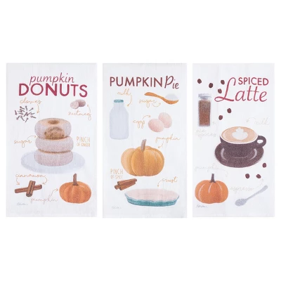 - Featuring festive prints of pumpkin donuts, pumpkin pie, and spiced lattes, this towel trio celebrates autumn’s most beloved treats. Each towel blends fun graphics with seasonal colors, adding charm and personality to your holiday kitchen décor.