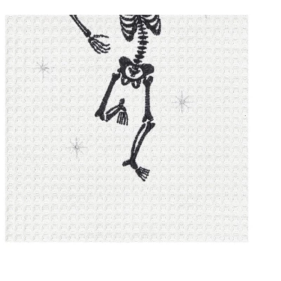 Celebrate the fall season with the Pumpkin Skeleton Kitchen Towel. This embroidered waffle weave towel showcases a whimsical, dancing skeleton adorned with a pumpkin head surrounded by snowflakes, bringing a touch of lighthearted spookiness to any kitchen. Ideal for Halloween festivities, this towel adds both style and functionality to seasonal decor.