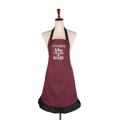 Seize the bottle and power with this apron which declares, “Given enough wine, I could rule the world.” This embroidered cotton canvas apron, in a rich shade of merlot, makes the perfect gift for a wine lover, be it a friend, family member, or yourself! Finished with black ruffle trim for a little flair. One size fits most, crafted of cotton and machine washable for easy care.