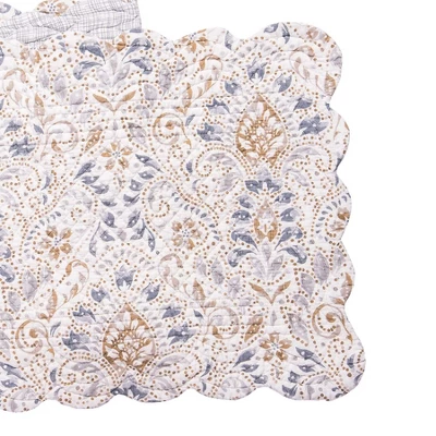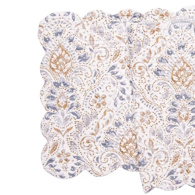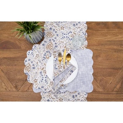 The Selma tabletop collection has a printed design of beautiful damask watercolor floral and dots in shades of blue, tan, gray, and gold. The scallop-edge table linens reverse to a gray textured abstract pattern. Available as a napkin, placemat, round placemat, and runner. Love this pattern? Selma is also available as a bedding collection.