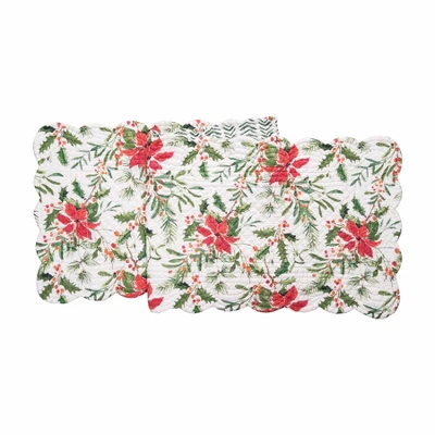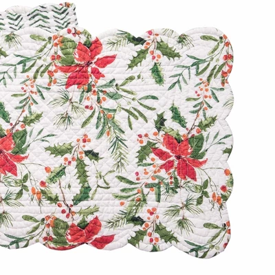 The Silvia Poinsettia quilted tabletop collection is perfect for the holiday season featuring a classic red poinsettia, Christmas holly, and berries pattern. The scallop-edge table linens reverse to a simple chevron pattern for additional styling options. Available as a napkin, placemat, round placemat, and runner. Love this pattern? Silvia Poinsettia is also available as a bedding collection.