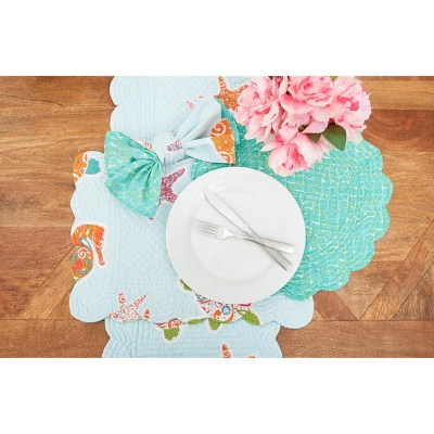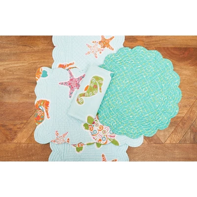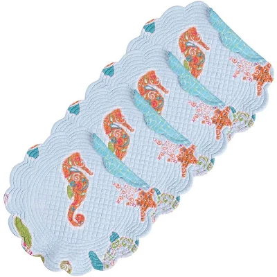 Add coastal charm to your table with these St. Kitts Seahorse Starfish Sea Turtle Quilted Placemats. Made from 100% cotton, this reversible set of six is perfect for beach house dining and summer gatherings, offering both style and durability. Ideal for gift-giving.