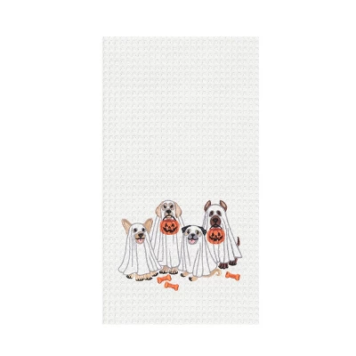 - Featuring adorable ghost dogs in playful Halloween costumes surrounded by cheerful jack o’ lantern pumpkins, this dishtowel brings warmth and charm to your kitchen. The detailed print enhances the festive mood and blends easily with fall décor.